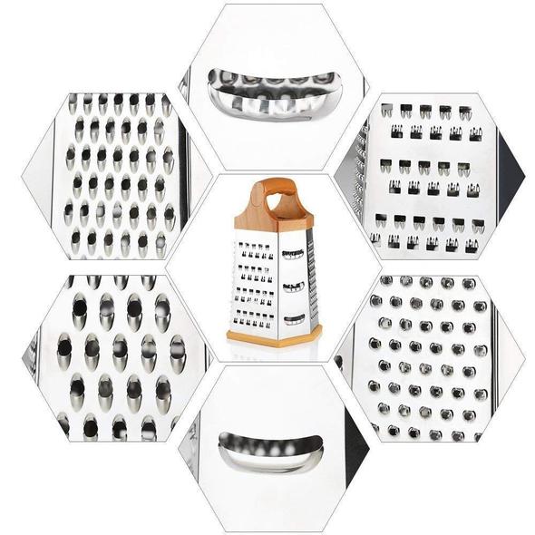 - ✔️6 Graters in 1: 1. Coarse shaver 2. Ultra coarse 3. Medium shred 4. Fine shred / zester 5. slicer 6. Shredding star. The Hexagonal-sided design of multipurpose grater provides you a variety of customized shred thickness meet your different needs.