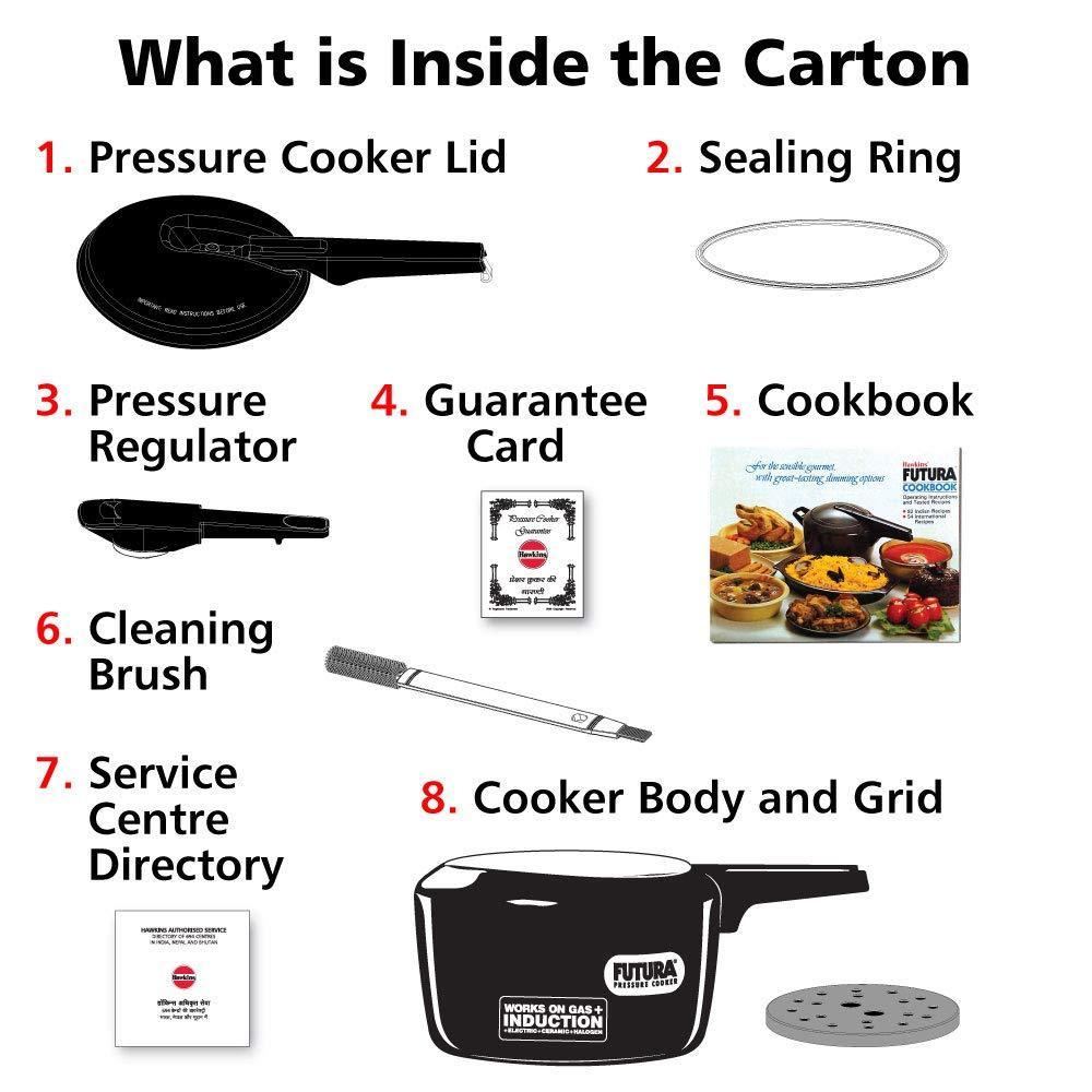 - Package Contents: 1 – Pressure Cooker Lid, 1 – Rubber Gasket, 1 – Vent Weight, 1 – Guarantee Card, 1 – Cookbook, 1 – Cleaning Brush, 1 – Service Centre Directory, 1 – Cooker Body, 1 – Grid