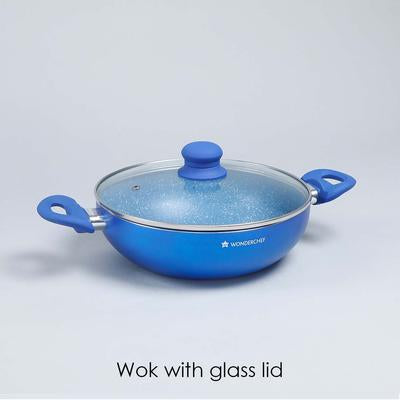 Enhance your cooking and dining experience with the most popular Wonderchef Royal Velvet cookware range. The marble finish gives the aluminium cookware a stylish and modern look. Wonderchef Royal Velvet Set includes large-sized 24 cm Wok, Fry Pan & 24 cm Dosa Tawa with a common lid, 14 cm Mini Fry Pan, thus providing a complete cooking solution for healthy and low-fat home-cooked meals. Finest non-stick coating for healthy, low fat, and delicious meals.