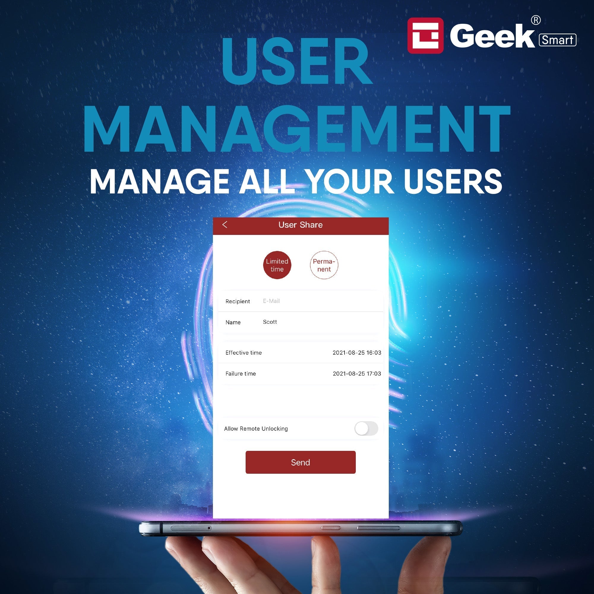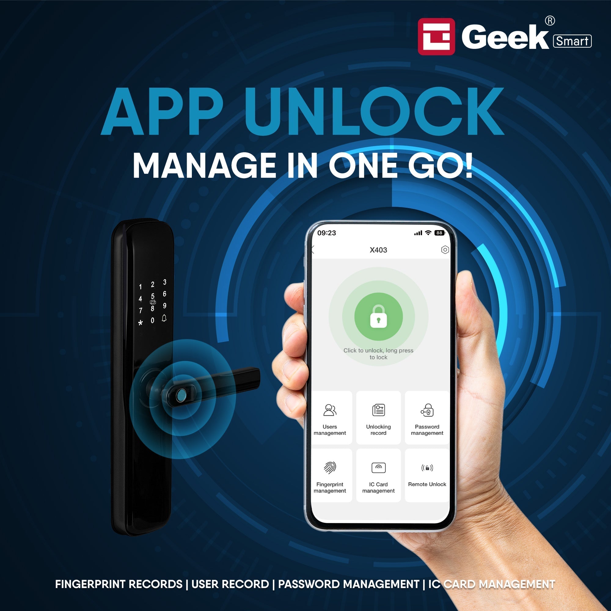 APP MANAGEMENT: Download and Use Geek Smart App from the Google play store and you can manage all the users. Includes deleting expired users or permanent users and view all of the Lock/Unlock records from your phone.