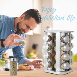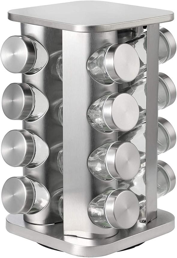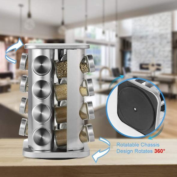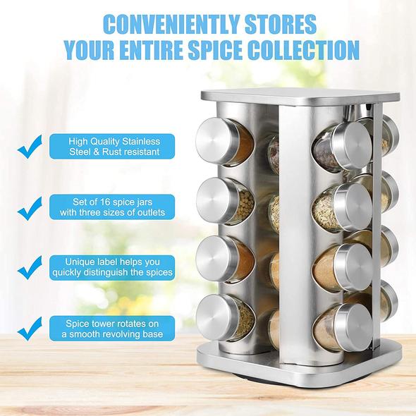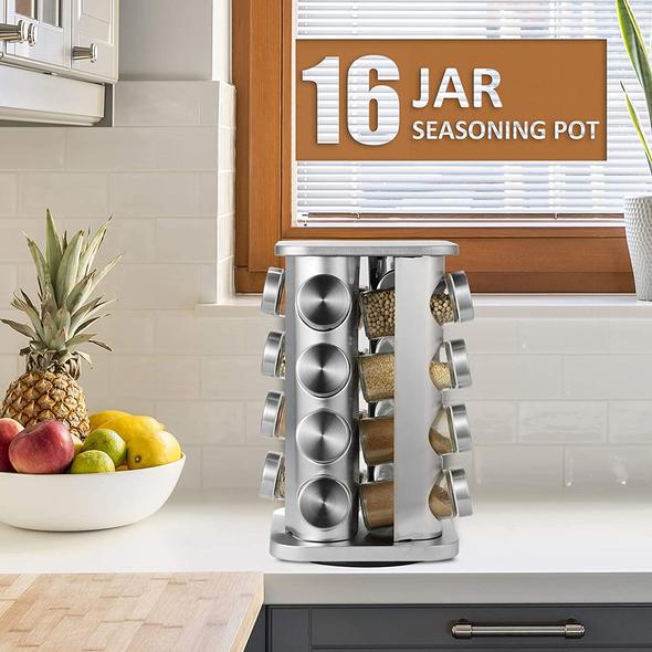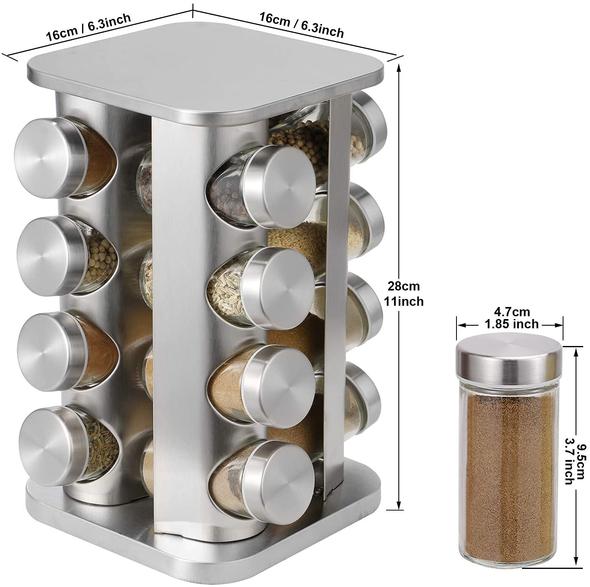 - 【HIGH QUALITY MATERAL】 High quality 100% stainless steel,rust resistant and robust.black plastic rotating base, glass bottle body, a flexible plastic lid with holes for accurate spice dosage,16 jars (not including spices) can provide enough space for different kinds of spices to make your cooking more interesting!
