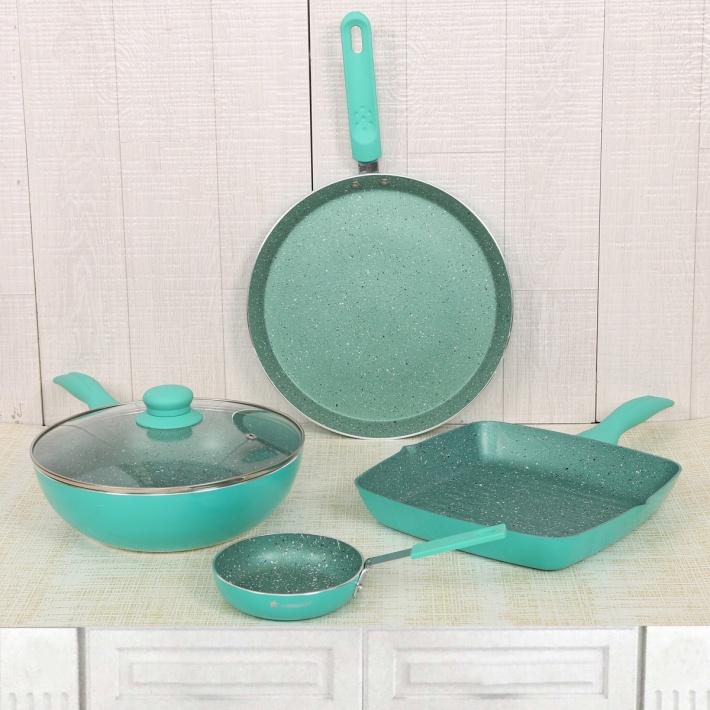- Pack Content : 1 Wok With Lid, 1 Grill Pan, 1 Dosa Tawa, 1 Tadka Pan